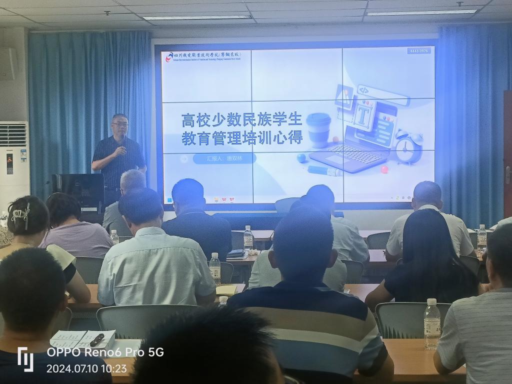 本次培训由校级培训和二级学院自主培训组成,包含培训分享、专题交流、工作实务等内容。校级培训阶段,王静、唐双林老师分别分享了参加四川省教育厅高校学工队伍意识形态工作能力提升培训、高校少数民族学生教育管理培训,内容涵盖红歌中的时代风华、高校舆情处置、高校心理健康教育、高校反恐工作、少数民族毕业生就业工作重难点、铸牢中华民族共同体意识等专题。学生处卓伟、阳诚结合辅导员日常工作,分别作辅导员日常事务管理技巧、资助工作实务专题培训。培训内容丰富、兼具理论和实践指导,对实际工作具有指导意义。
